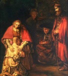 De vader heeft zijn jongste zoon los moeten laten, hem zijn eigen wegen laten zoeken. Zijn jongste zoon zijn eigen fouten laten maken. En toch blijft de vader op zijn post. De vader staat op de wacht. En toen de zoon eindelijk op zijn schreden terugkeert, ontvangt de vader de jongste zoon met open armen. De vader blijft de jongste zoon solidair.