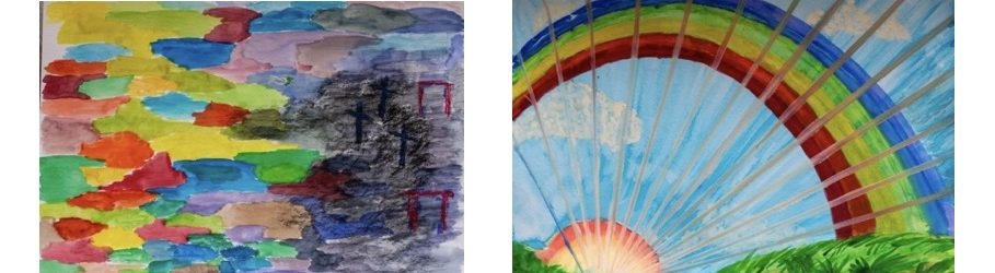 Kunst en kerk. Voor de Paasmorgenviering van zondag aanstaande hebben zeven mensen uit onze kerk een verbeelding gemaakt van verhalen van opstanding in de bijbel. Over Licht en Donker, over mensen die blijven staan voor het Goede, over ramen die worden geopend om duiven los te laten, over teksten die ons onderweg gaande houden en sterk maken. Over hoop en regenbogen, over deurposten die gemarkeerd worden zodat het kwade voorbijtrekt.