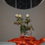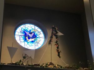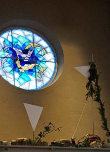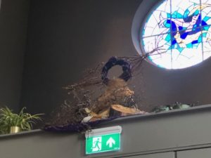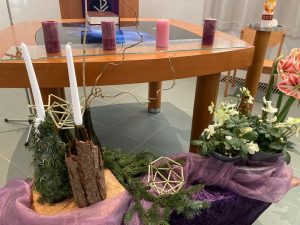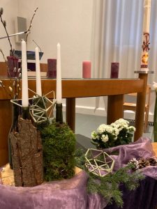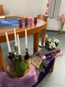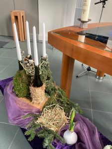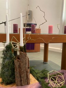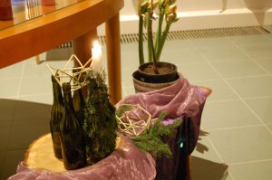 Er zijn scherven en barsten en tussen de openingen hiervan komt het licht. Hoe dichter bij Kerst, hoe minder gebroken spiegelscherven op de donkere achtergrond. De bloemschikking wordt ook steeds lichter van kleur, het licht begint te schijnen. Zien wij het en laten wij het toe in ons leven? In de beweging tussen donker naar licht vieren wij Advent en Kerst.