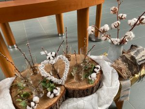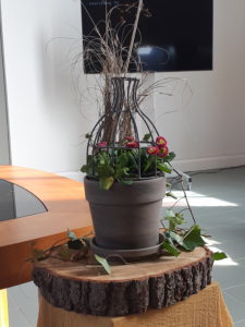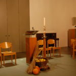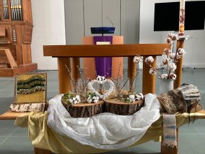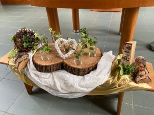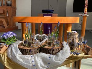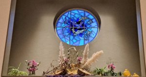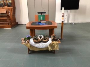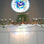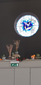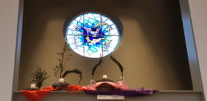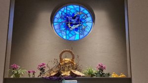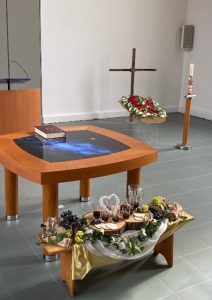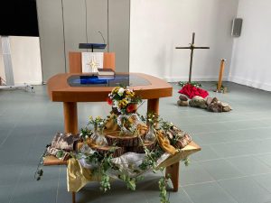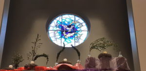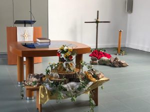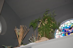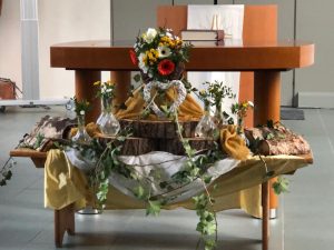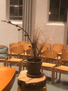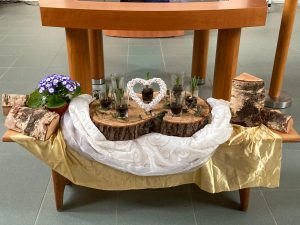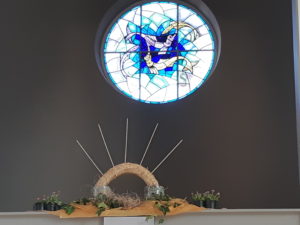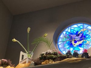 Voor de viertafel en/of in de apsis wordt bij speciale vieringen een symbolische schikking gemaakt. Dat noemen we een liturgische bloemschikking.