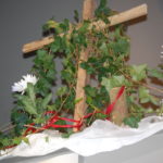 • Houten kruis met aan de voet rode anemonen als symbool van het bloed van Jezus.