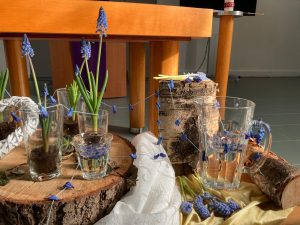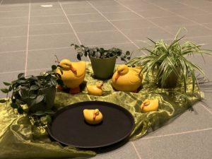 We vieren de overwinning op de dood. Een dag vol beweging. De opgestane Heer blijkt dichterbij dan wij misschien wel dachten. In de schikking is beweging verbeeld.