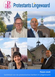 In vijf bijeenkomsten heeft de ‘kernredactie’ bestaande uit de predikanten, Simone van Wezel, Wil van Seggelen, Arendina Visser, Herman Schimmel en Jan Willem Faasse zich gebogen over de inhoud en vormgeving van het blad. Bijvoorbeeld de keus voor kleurendruk, het aantal bladzijden en de opmaak. Door de spreiding van de werkdruk is iedere kern twee keer per jaar verantwoordelijk voor de hoofdartikelen. Ook is gesproken over het Redactiestatuut waarin de verantwoordelijkheden voor het blad is geregeld. Op 9 maart is de Kick-off geweest en heeft de redactie gekozen voor de naam ‘Protestants Lingewaard’. En nu ligt er dit nieuwe kerkblad voor u. Net uit het ei en met vochtige haartjes. U begrijpt dat het blad nog moet groeien voordat het zijn volwassen uiterlijk krijgt. U kunt ons helpen door opbouwende opmerkingen en het terugkoppelen van zaken die beter kunnen.